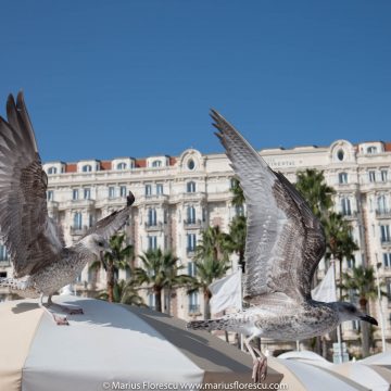 Fighting sea-gulls on the pier at the historic Hotel Carlton Cannes